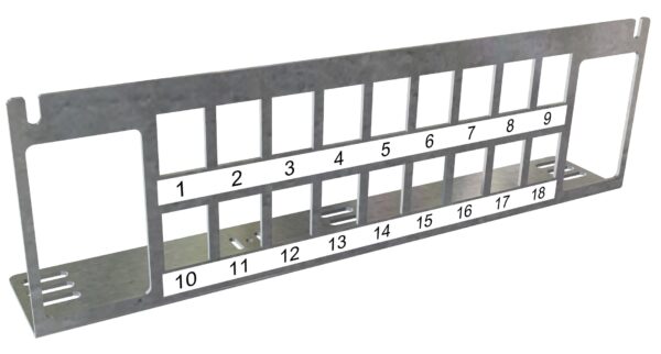 for 18 Keystone modules (19.4 mm cutout) or R&M Snap-in modules and 2 FLF, empty