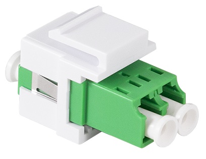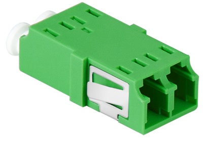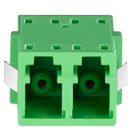 2x connettori LC duplex, apertura SC simplex, con clip metallica per montaggio a scatto, senza flangia, manicotti in ceramica, corpo monoblocco, PC UL 94V0, con cappucci antipolvere, colore del corpo: verde, per l’installazione in distributori con fissaggio a clip