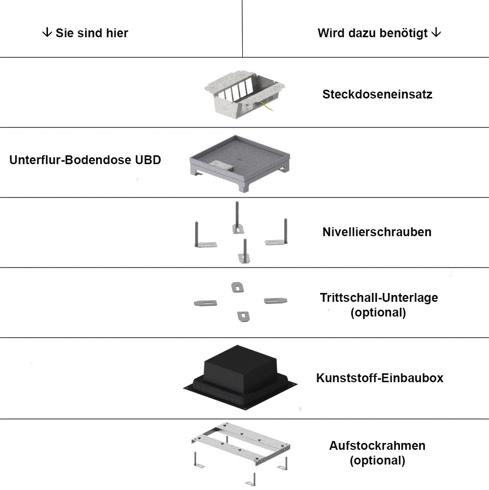 Home > Alle Produkte > UBD 262 257 – Unterflur-Bodendose UBD 260 inkl. Deckel, flach (SVZ), ohne Kante, 5mm Vertiefung und 2 Schnurauslass