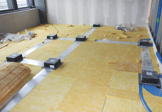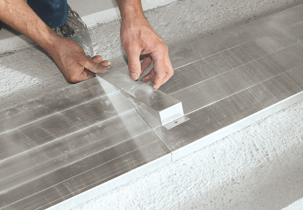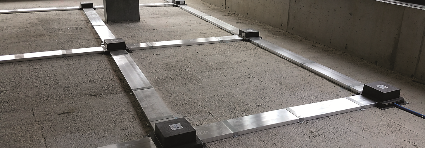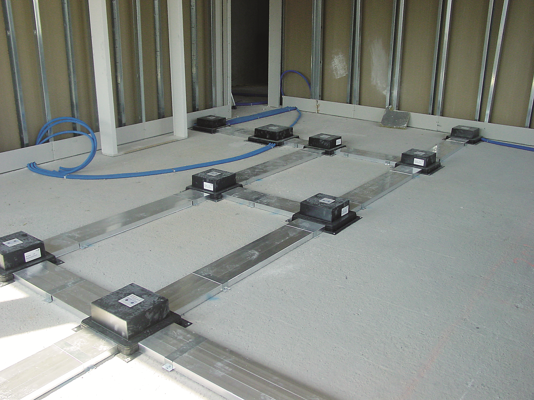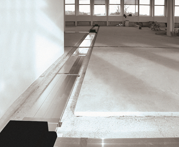Die Montage des UFK-Systems ist denkbar einfach und zeitsparend. Die geplanten Kanalwege sowie die relevanten Stellen für Zug- und Gerätedosen werden auf dem Boden markiert. Die Aluminium-Profile können auf dem Boden ausgelegt und die Einbau-Boxen an den Ecken befestigt werden. Danach lassen sich die benötigten Kanallängen ermitteln und die Kanäle mit Hilfe der Befestigungsbriden auf dem Untergrund befestigen.